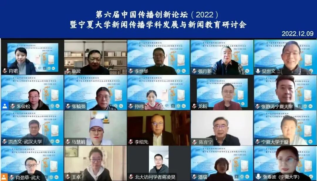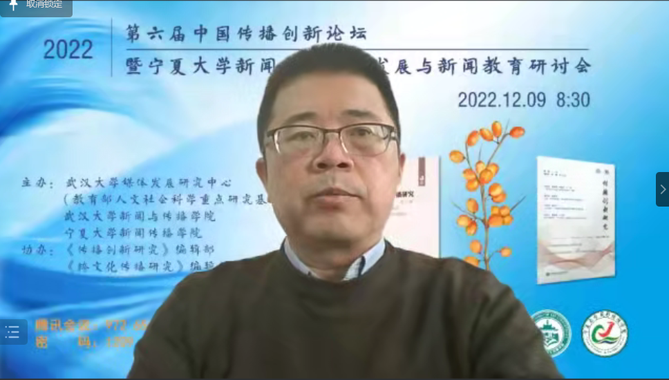 12月9日,由taptap新人注册(教育部人文社会科学重点研究基地)、taptap点点bet登录入口新闻与传播学院、宁夏大学新闻传播学院共同主办的“第六届中国传播创新论坛(2022)暨宁夏大学新闻传播学科发展与新闻教育研讨会”顺利召开。来自taptap点点bet登录入口、宁夏大学、复旦大学、中国传媒大学等的专家学者云端相聚,共话中国传播创新,并对宁夏大学新闻传播学科发展与新闻教育提出对策建议。论坛会议吸引了140多位师生聆听学习。